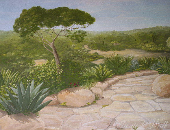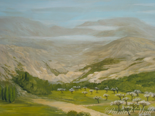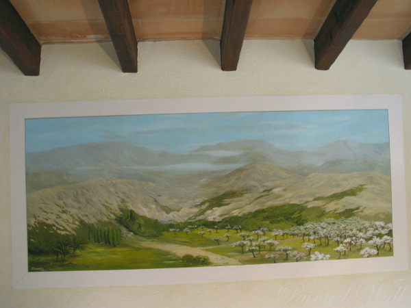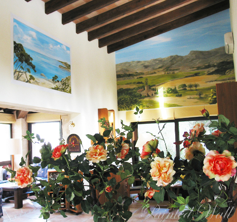 En Mallorca tambien se creó este mural en una finca. Las habitaciones con techos sumamente altos permiten muchas diferentes formas de decoración , en este caso diseñamos una vista hacia lo lejos.