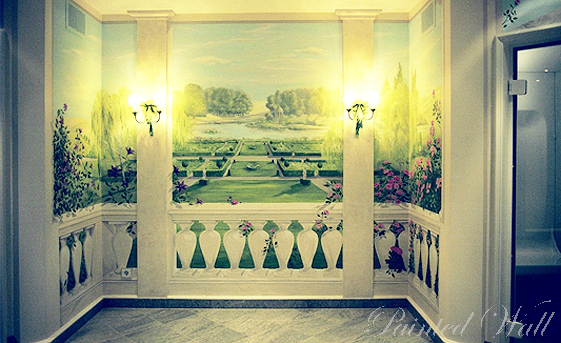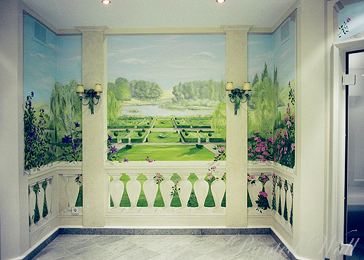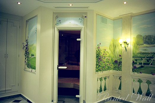 Este centro/espacio de wellness privado se diseño por nosotros en forma de una terraza con vista a un jardin inglés. Las puertas que llevan a las instalaciones de saunas se han incluido en la arquitectura. Sobre todo rosas decoran los balcones.