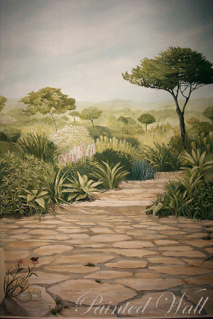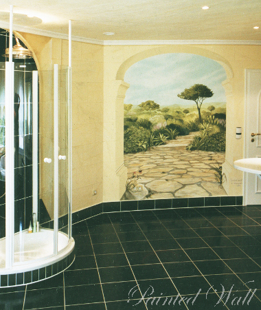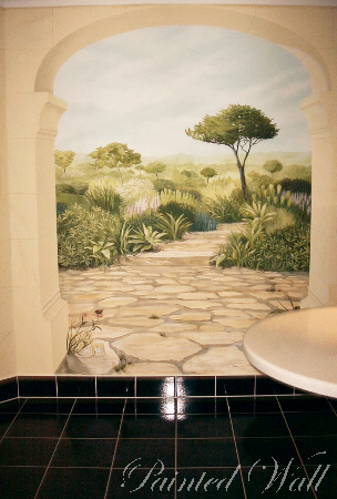 Los murales en este cuarto de baño llevan la vista del observador a un jardin mediterraneo.